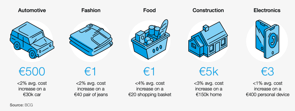 How can this be? As an example, consider the steel that goes into a midsize family car with a $35,000 sticker price. Producing steel is one of the most emissions-intensive activities in the supply chain. Producing zero-carbon steel can increase the steel makers’ costs significantly—by as much as 50% in some cases. But since steel accounts for only roughly $1,000 of total car costs, the markup on this final product will be much, much lower. In fact, the same car made with exclusively zero-carbon materials would cost only about $600 more—or roughly a difference of 2%. Considering that getting there will take even the most ambitious companies many years, the immediate economics look much less scary.