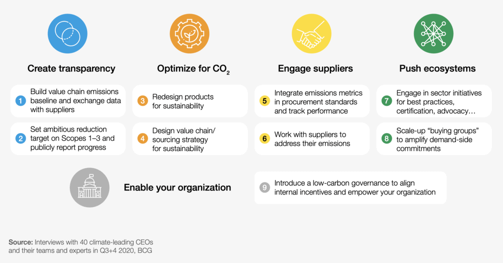 Through interviews with several dozen global companies that lead the way in reducing supply-chain emissions, nine key actions were identified to overcome barriers: